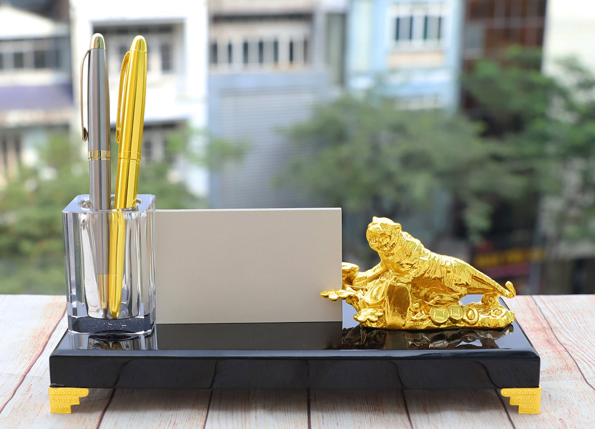 Bên cạnh các thiết kế truyền thống, tượng Hổ Vàng Vượng Cát 3 trong 1 mang đến hướng tiếp cận hiện đại hơn khi kết hợp giữa phong thuỷ và công năng sử dụng. Hình tượng hổ vẫn giữ thần thái uy nghiêm, mạnh mẽ, trong khi phần đế được tích hợp thêm tiện ích như giá cắm bút và đựng danh thiếp. Thiết kế này không chỉ giúp tối ưu không gian bàn làm việc mà còn mang ý nghĩa thu hút cơ hội, hỗ trợ công danh và mở rộng các mối quan hệ, đặc biệt phù hợp với doanh nhân và môi trường văn phòng.
