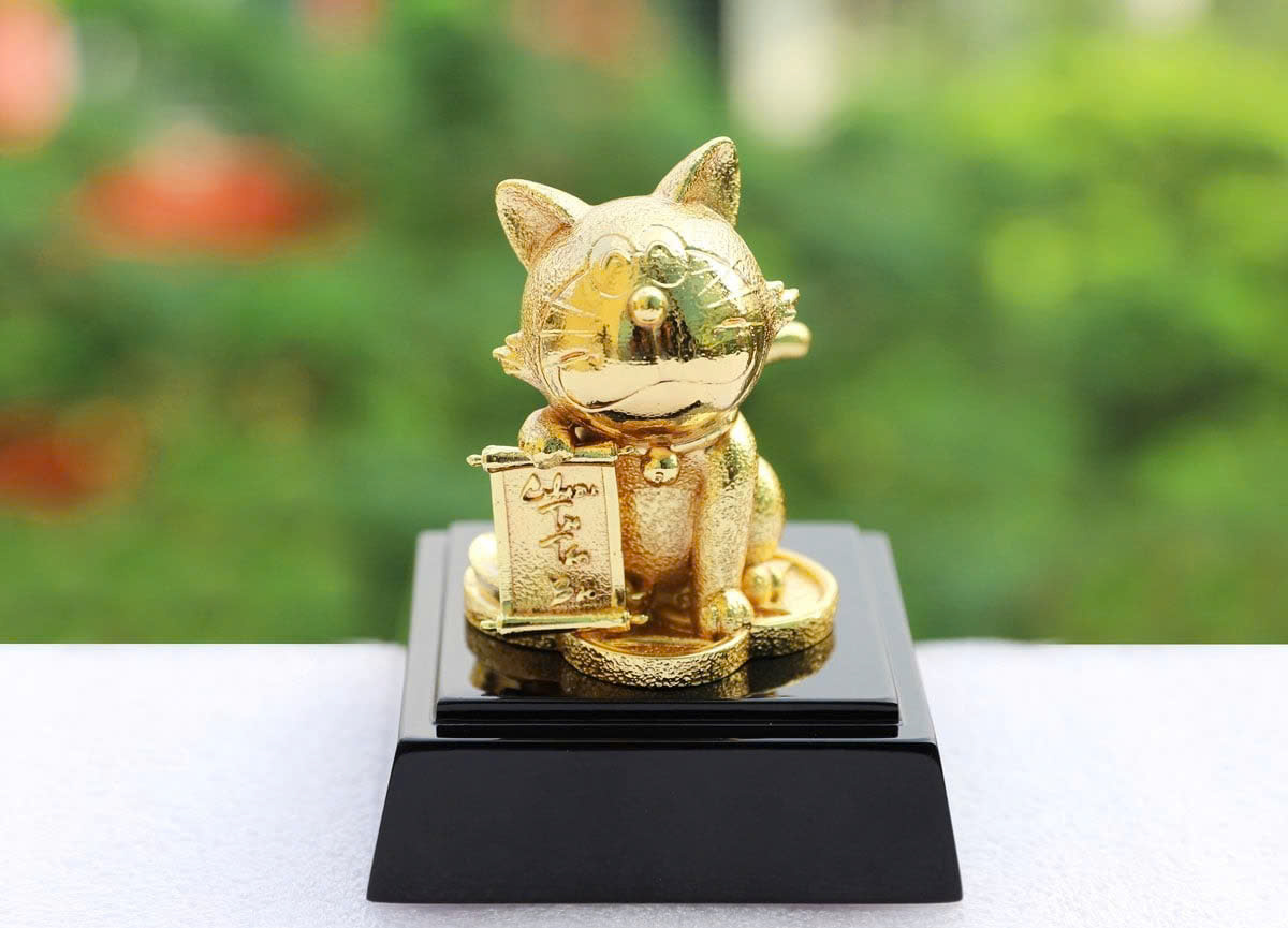 Bên cạnh đó, tượng Mèo Thần Tài mạ vàng lại mang đậm yếu tố tài lộc với hình ảnh chú mèo may mắn, biểu trưng cho việc thu hút tiền bạc và cơ hội kinh doanh. Đây là mẫu tượng rất được ưa chuộng trong giới kinh doanh và buôn bán.