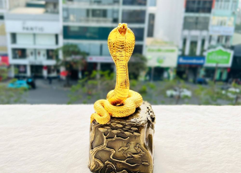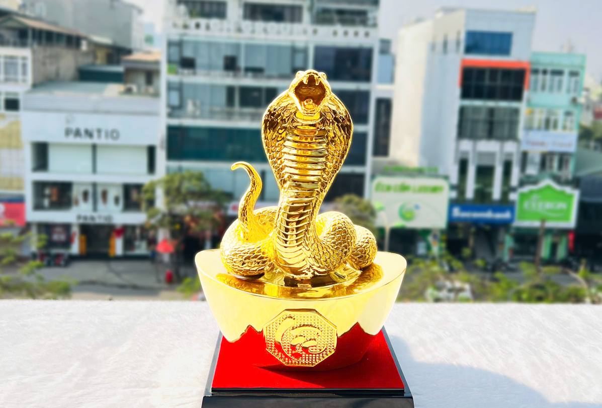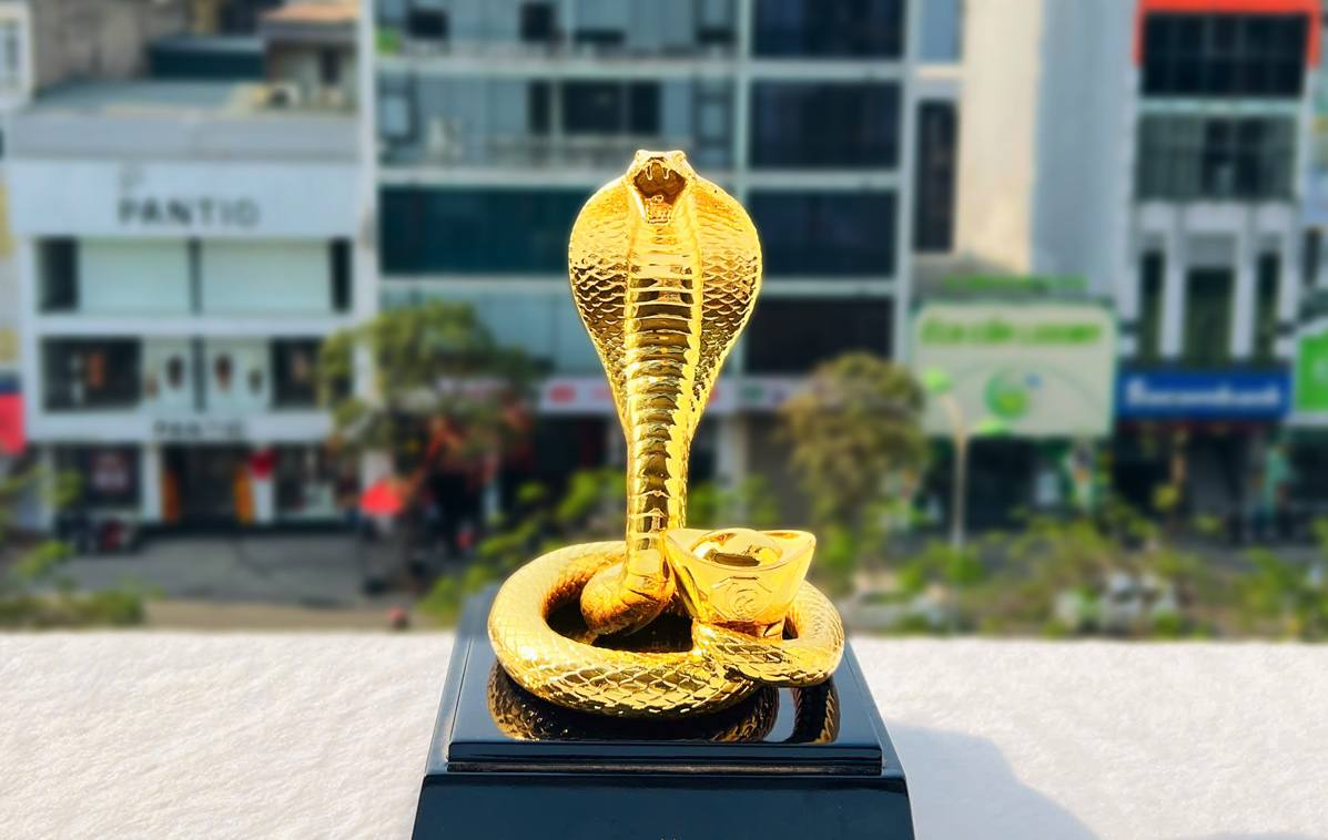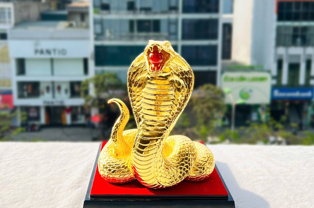 Tượng Rắn mạ vàng gây ấn tượng bởi thiết kế uyển chuyển, mềm mại nhưng vẫn toát lên sự mạnh mẽ và linh thiêng. Các tác phẩm được chế tác từ đồng vàng nguyên chất, sau đó mạ vàng 24K bằng công nghệ điện phân hiện đại, giúp bề mặt sáng bóng và bền mãi với thời gian.