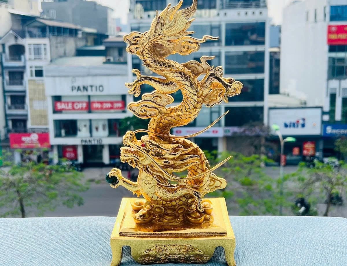 Tượng Rồng mạ vàng gây ấn tượng mạnh bởi thiết kế uyển chuyển nhưng đầy uy lực, thể hiện rõ thần thái linh thiêng của linh vật. Các sản phẩm được chế tác thủ công bởi nghệ nhân, kết hợp với công nghệ mạ vàng điện phân hiện đại, tạo nên bề mặt sáng bóng, bền đẹp theo thời gian.
